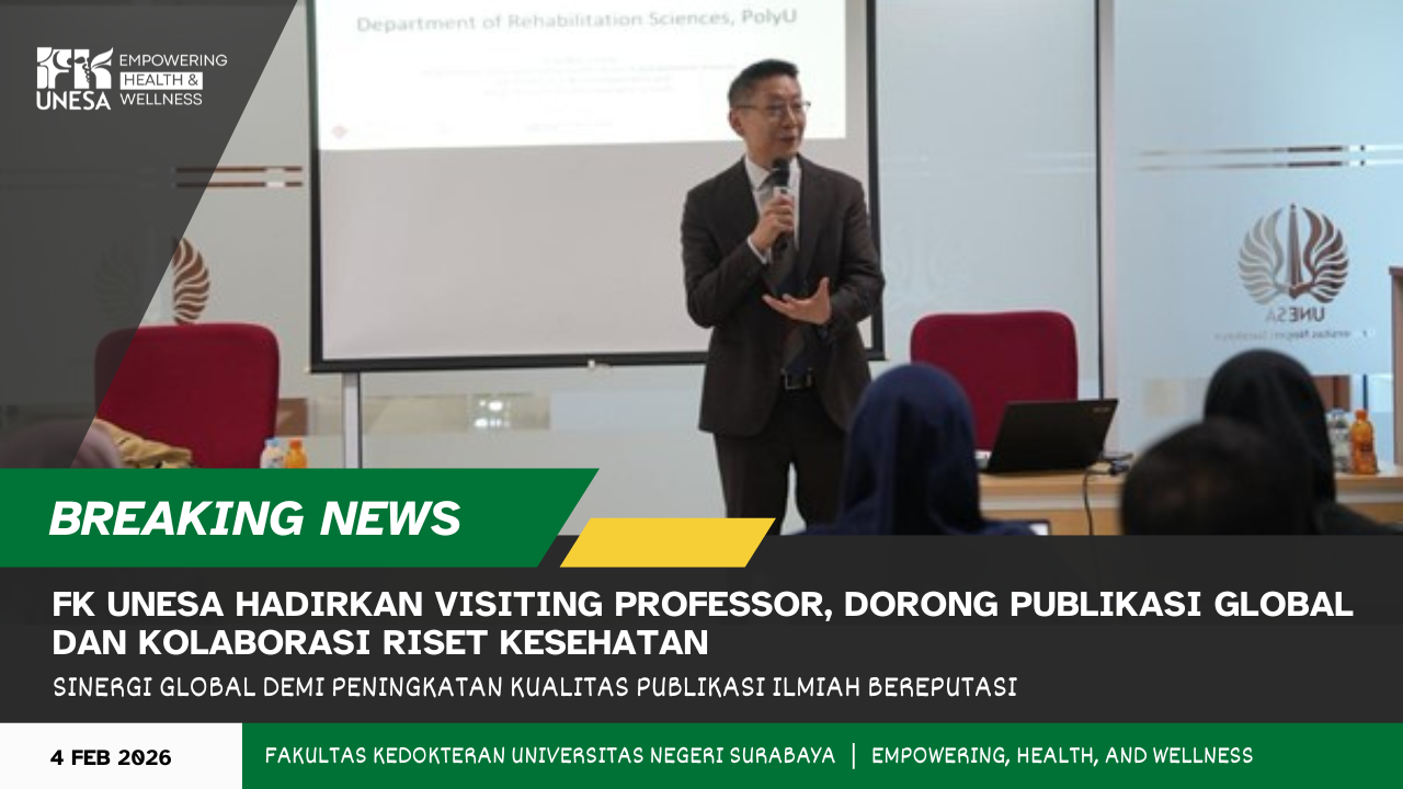 fk.unesa.ac.id., SURABAYA - Fakultas Kedokteran Universitas Negeri Surabaya (FK UNESA) menyelenggarakan program “Visiting Professor” dengan menghadirkan Prof. Dr. Marco Pang, Ph.D. pada 3-4 Februari 2026. Kegiatan ini merupakan bagian dari strategi penguatan internasionalisasi, peningkatan kualitas riset, serta pengembangan kolaborasi akademik di bidang ilmu kesehatan.